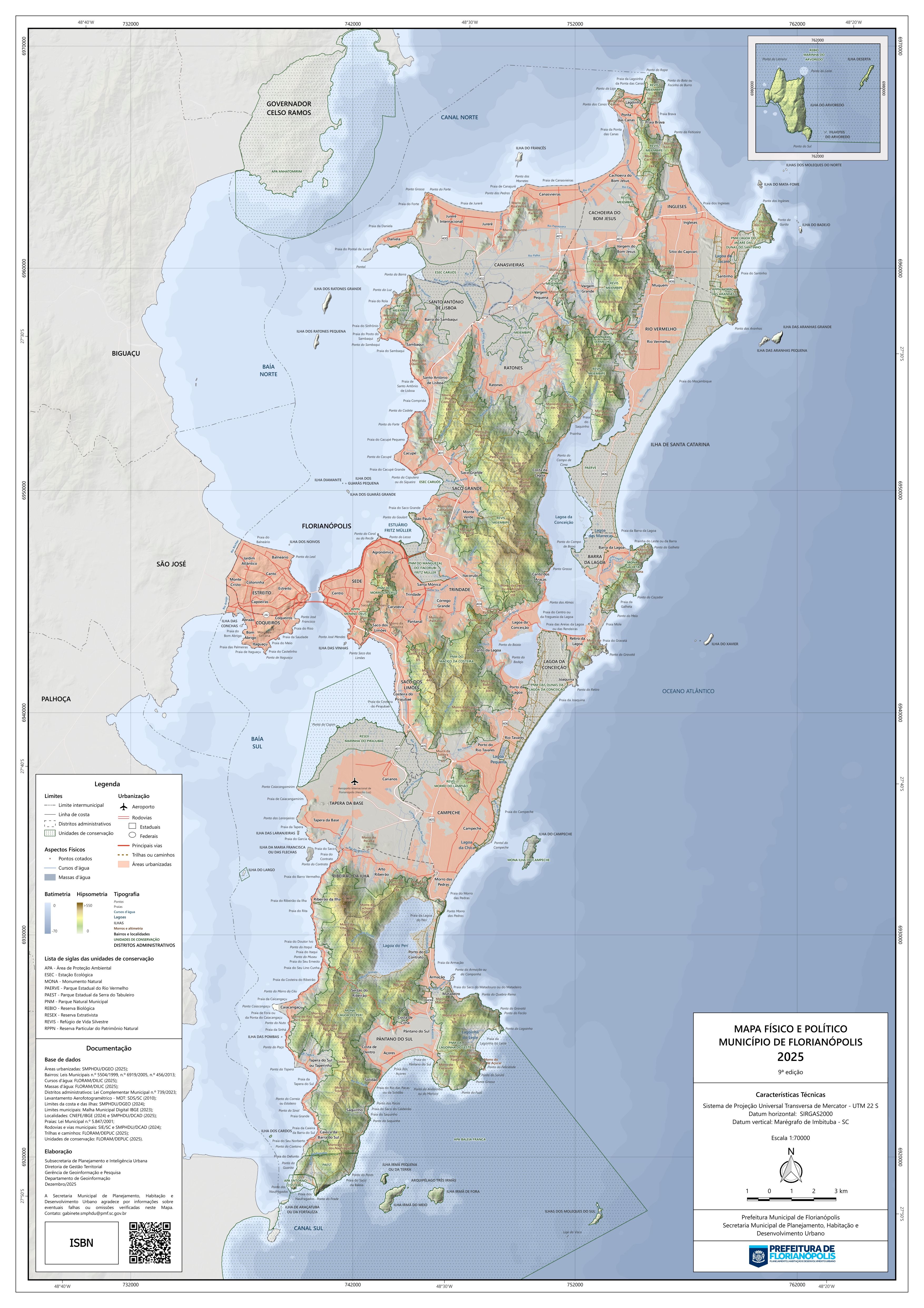 O Mapa de Aspectos Ambientais do Município de Florianópolis 2025 é um desdobramento do Mapa Físico Político de 2025, que visa representar cartograficamente os principais aspectos ambientais presentes no território municipal.