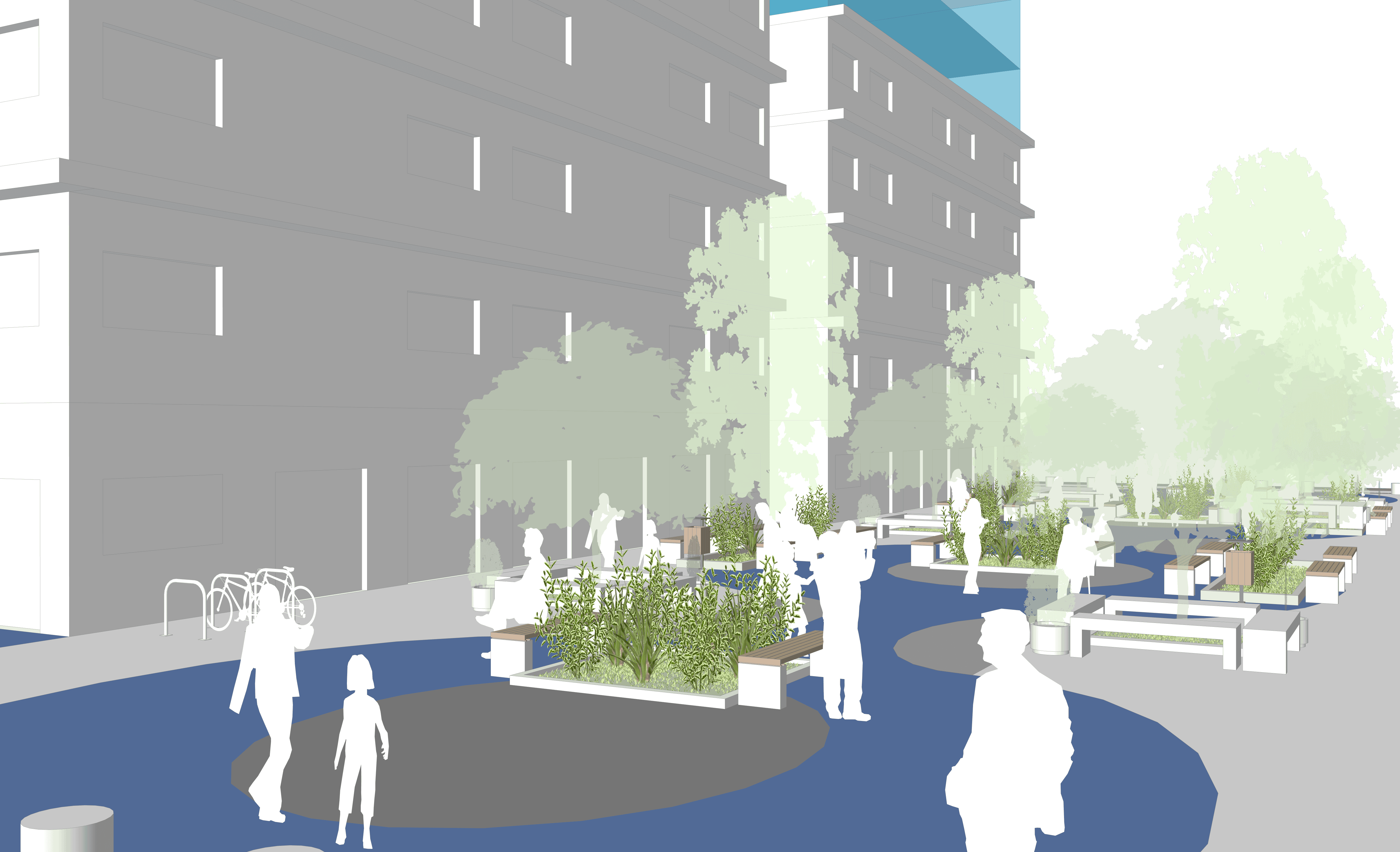 O objetivo aqui é criar espaços de estar confortáveis e convidativos, que favoreçam o encontro e o uso por pessoas de todas as idades, integrados ao paisagismo para garantir sombra e permanência. Os elementos de desenho apresentados abaixo representam o mínimo exigido para cada empreendimento em relação à qualificação dos passeios públicos, mobilidade, acessibilidade e infraestrutura urbana. Podem ser requeridos elementos e infraestruturas complementares dependendo das condições dos lotes e vias.